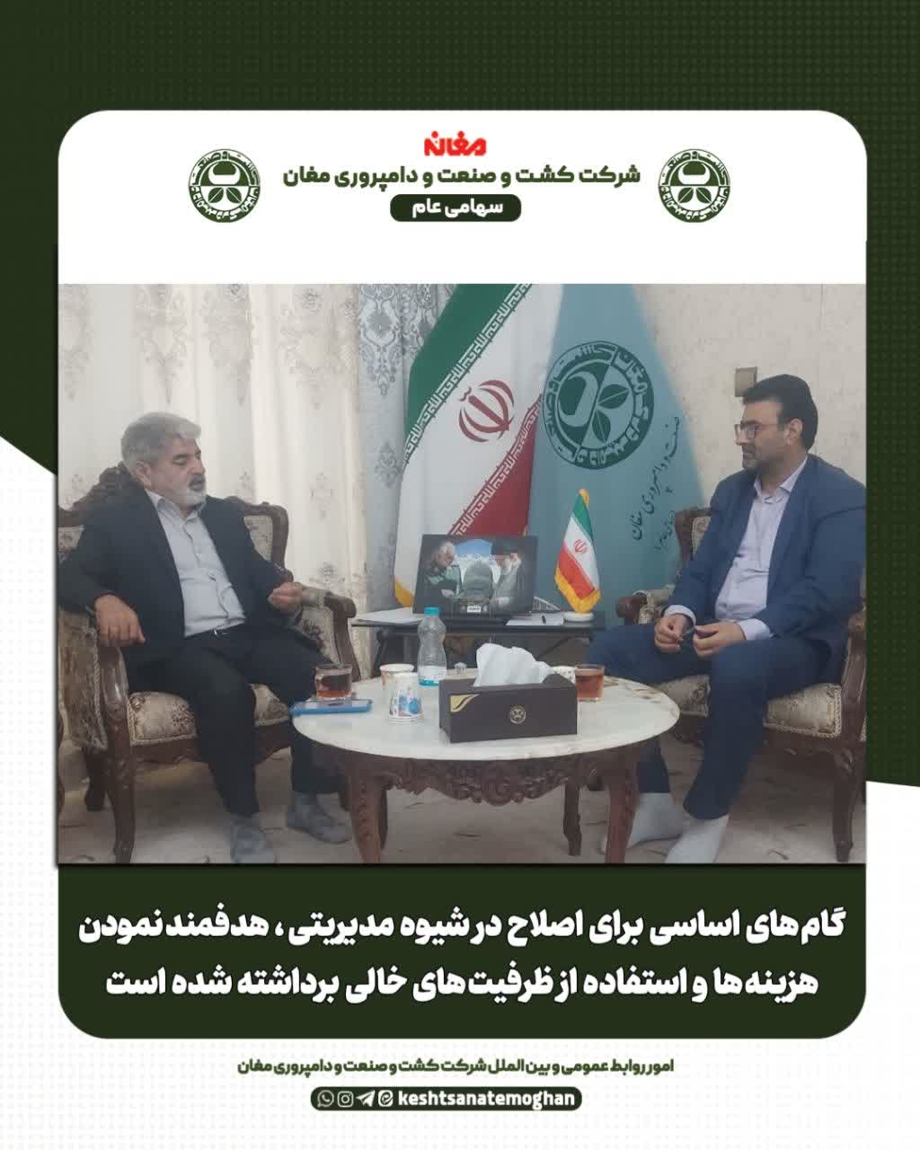 ✅ به گزارش امور روابط عمومی و بین الملل شرکت کشت و صنعت و دامپروری مغان در جریان دیدار نماینده مجلس از این بنگاه اقتصادی، آخرین اقدامات انجامشده در این مجموعه، بررسی و بر ضرورت ادامه روند اصلاحات مدیریتی تأکید شد.