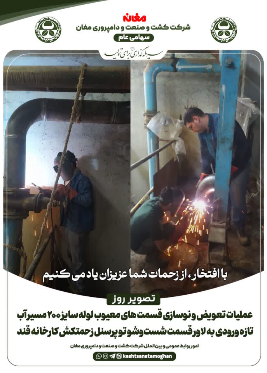 💢عملیات تعویض و نوسازی قسمت های معیوب لوله سایز ۲۰۰ مسیر آب تازه ورودی به لاور قسمت شستوشو توسط پرسنل زحمتکش کارخانه قند