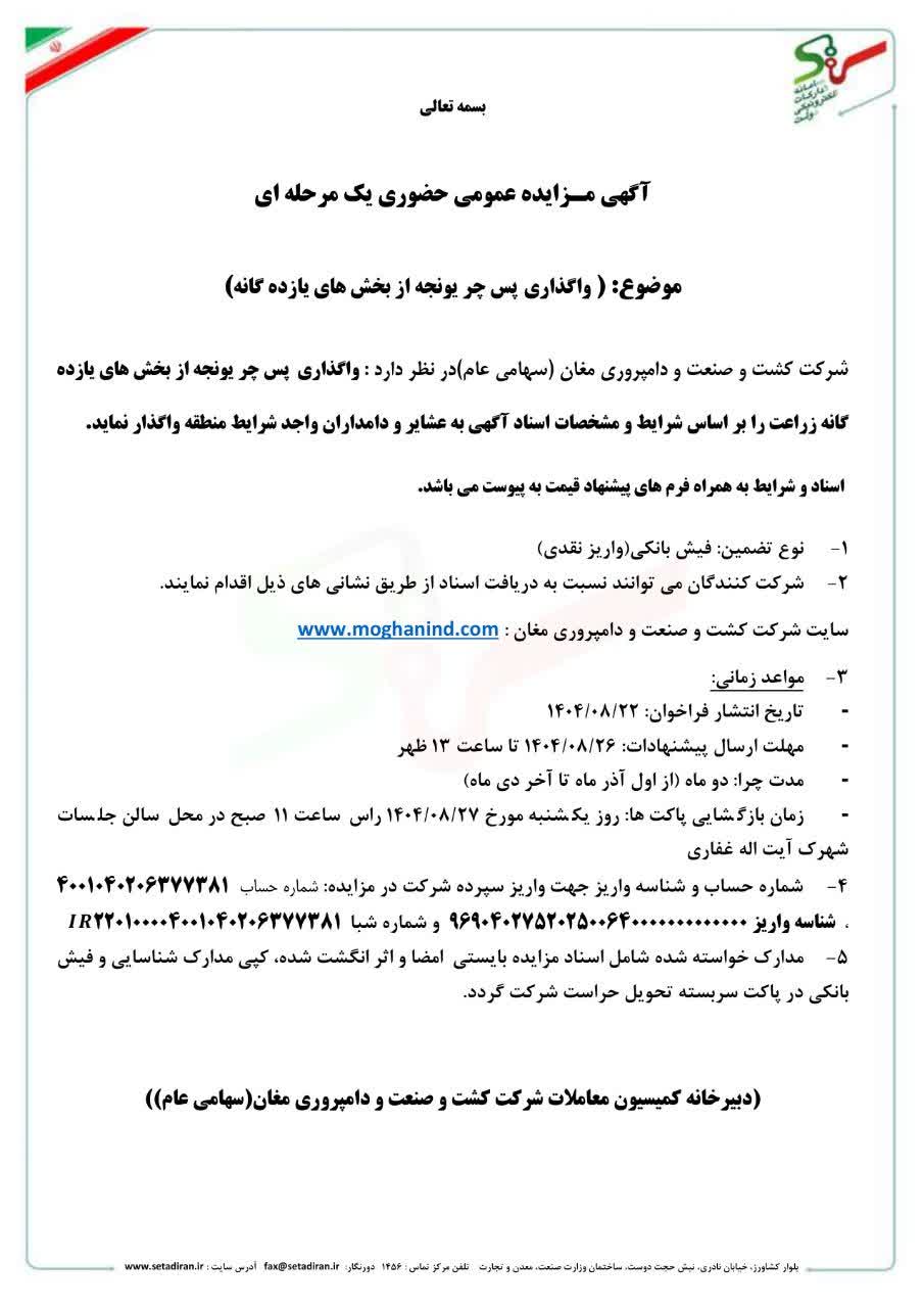 ✅شرکت کشت و صنعت و دامپروری مغان (سهامی عام)در نظر دارد : واگذاری پس چر یونجه از بخش های یازده گانه زراعت را بر اساس شرایط و مشخصات اسناد آگهی به عشایر و دامداران واجد شرایط منطقه واگذار نماید.