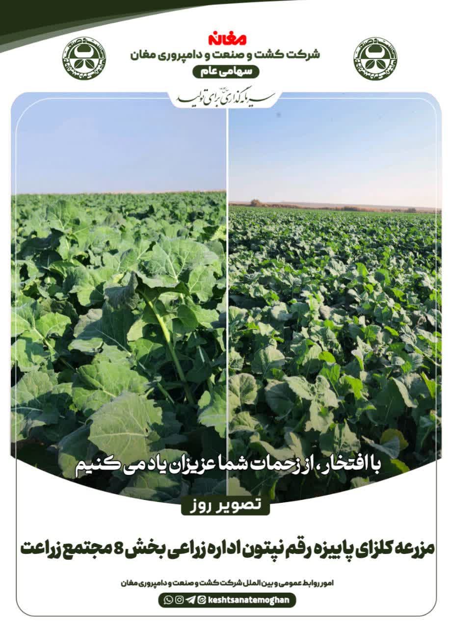 #تصویر_روز چاپ 🔰با افتخار،از زحمات شما عزیزان یاد می کنیم 💢 مزرعه کلزای پاییزه رقم نپتون اداره زراعی بخش 8 مجتمع زراعت 🔸 امور روابط عمومی و بین الملل شرکت کشت و صنعت و دامپروری مغان نوشته شده توسط روابط عمومی و امور بین الملل شرکت بازدید: 16 قبلی بعدی