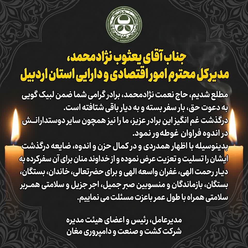 مطلع شدیم، حاج نعمت نژادمحمد، برادر گرامی شما ضمن لبیک گویی به دعوت حق، بار سفر بسته و به دیار باقی شتافته است. درگذشت غم انگیز این برادر عزیز، ما را نیز همچون سایر دوستدارانش در اندوه فراوان غوطه ور نمود. بدینوسیله با اظهار همدردی و در کمال حزن و اندوه، ضایعه درگذشت ایشان را تسلیت و تعزیت عرض نموده و از خداوند منان برای آن سفرکرده به دیار رحمت الهی، غفران واسعه الهی و برای حضرتعالی، خاندان، بستگان، بازماندگان و منسوبین صبر جمیل، اجر جزیل و سلامتی همراه با طول عمر باعزت مسئلت می نماییم.