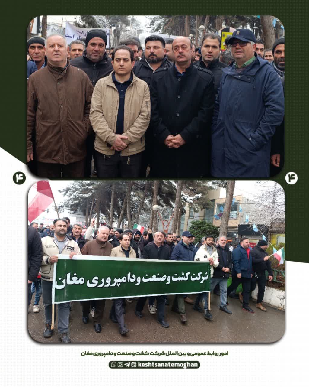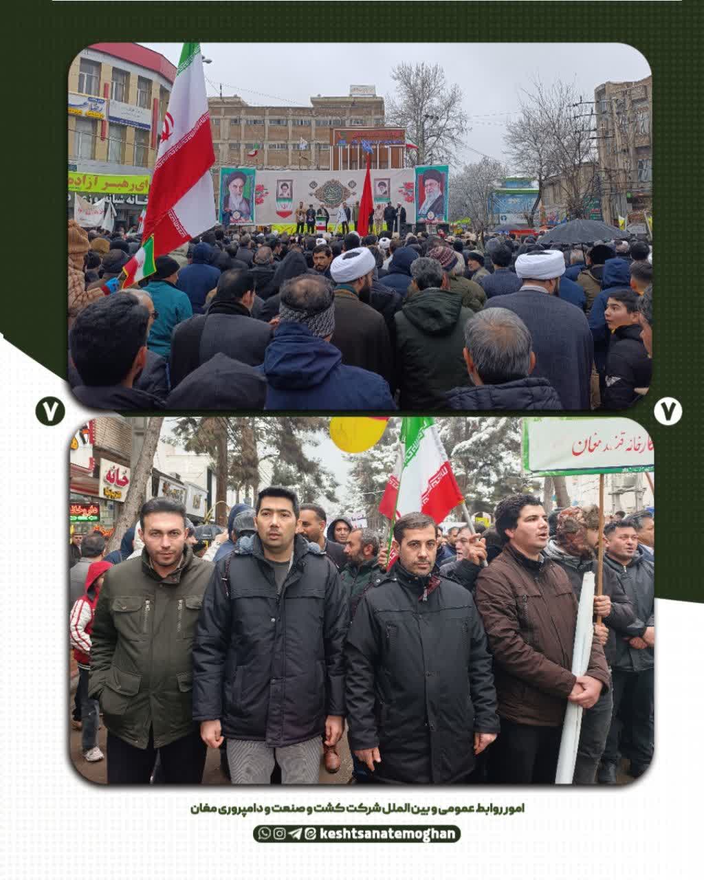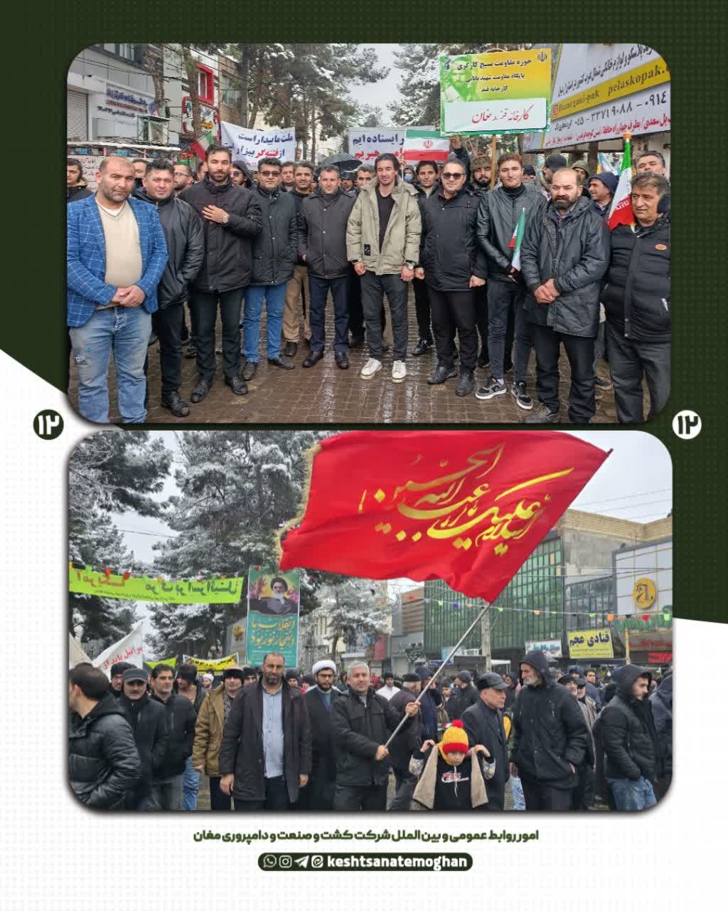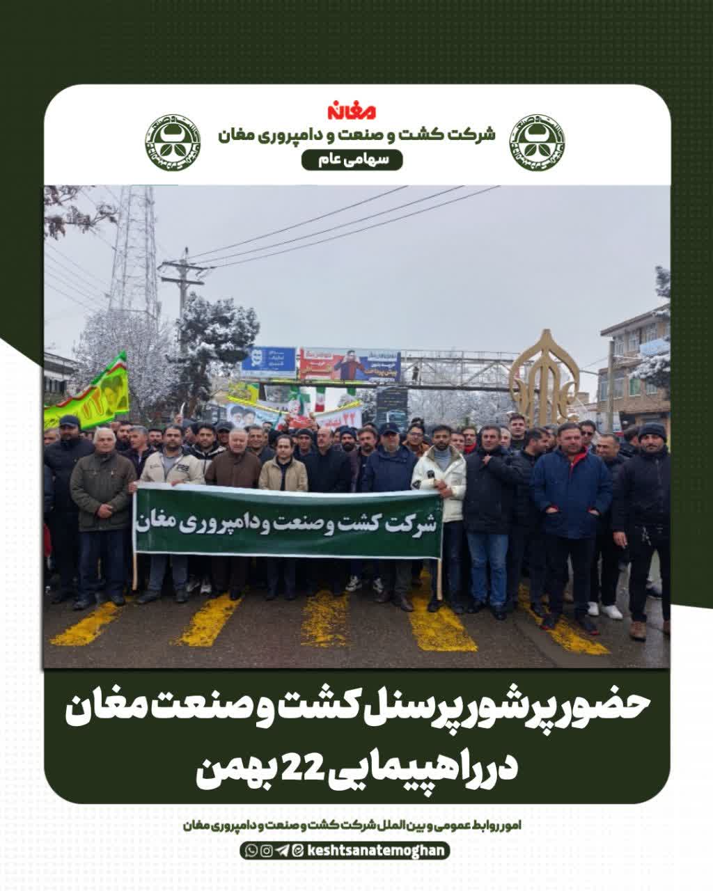 ⏪ همراه با امت همیشه در صحنه ایران اسلامی؛ مدیرعامل، رئیس، اعضای هیئت مدیره، مدیران میانی و جمعی از کارکنان شرکت کشت و صنعت و دامپروری مغان در راهپیمایی یوم الله 22 بهمن حضور یافتند.
