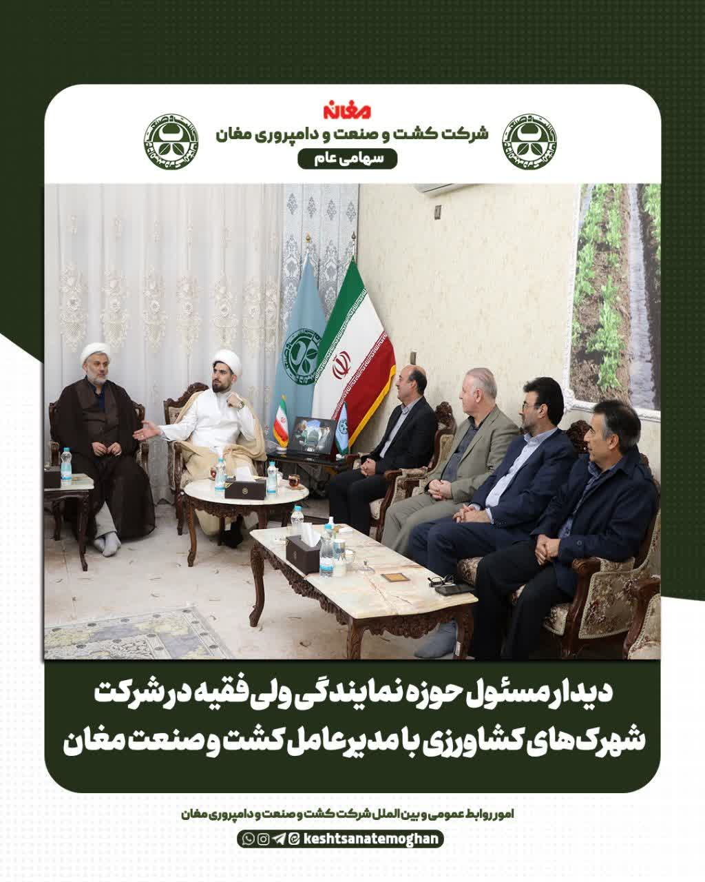 ⏪ حجتالاسلام علی امدادی، مسئول حوزه نمایندگی ولیفقیه در شرکت شهرکهای کشاورزی با حضور در شرکت کشت و صنعت و دامپروری مغان، با مهندس خلیل نیکشاد، مدیرعامل و اعضای هیئتمدیره این مجموعه دیدار و گفتوگو کرد.
