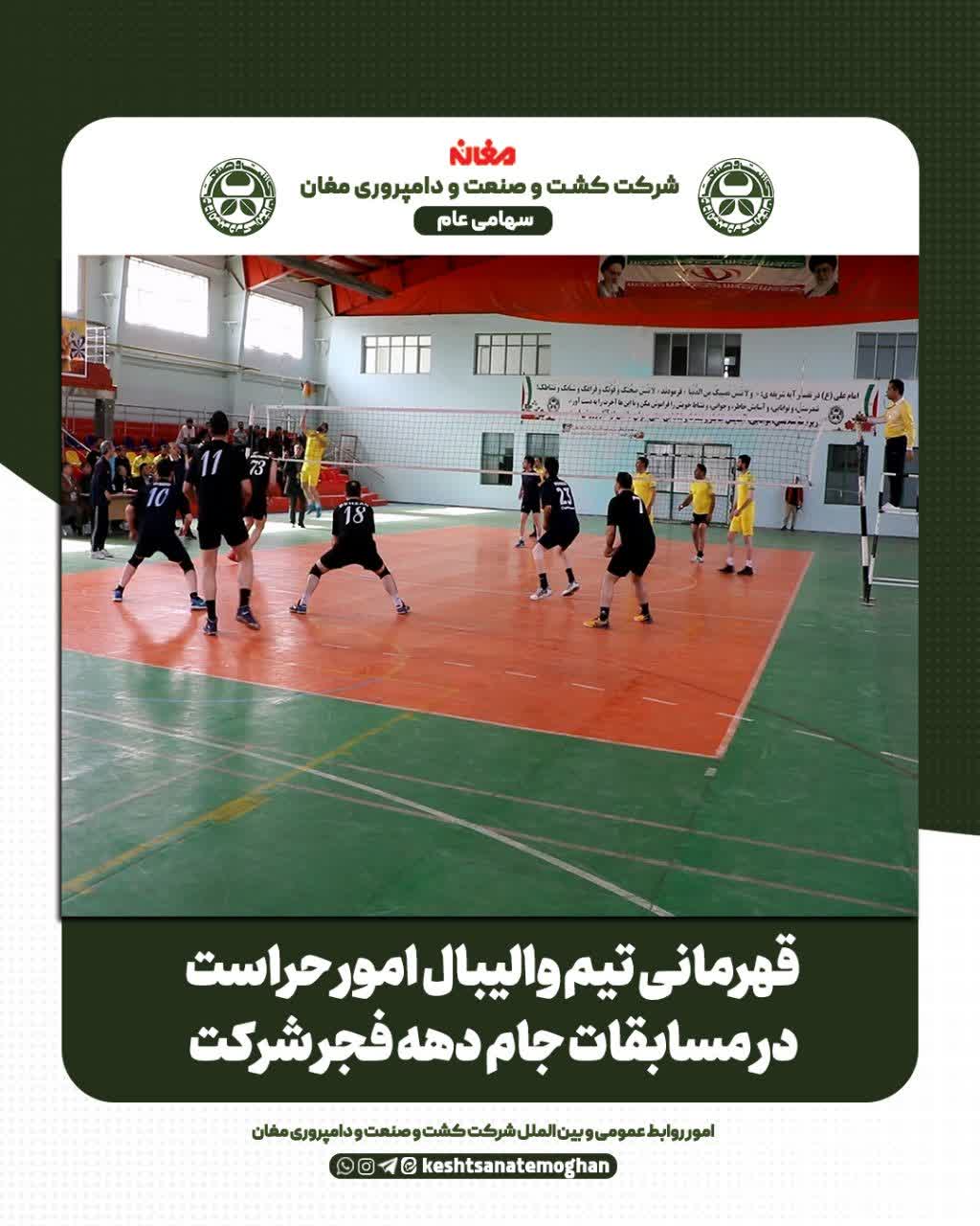 ⏪ تیم والیبال امور حراست شرکت کشت و صنعت و دامپروری مغان در مسابقات جام ورزشی دهه مبارک فجر با غلبه بر تیم اداره مرکزی، قهرمان این دوره از مسابقات گردید.
