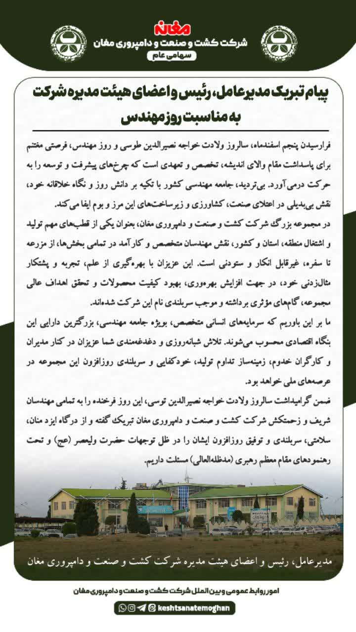 ✅ ضمن گرامیداشت سالروز ولادت خواجه نصیرالدین توسی، این روز فرخنده را به تمامی مهندسان شریف و زحمتکش شرکت کشت و صنعت و دامپروری مغان تبریک گفته و از درگاه ایزد منان، سلامتی، سربلندی و توفیق روزافزون ایشان را در ظل توجهات حضرت ولیعصر (عج) و تحت رهنمودهای مقام معظم رهبری (مدظلهالعالی) مسئلت داریم.