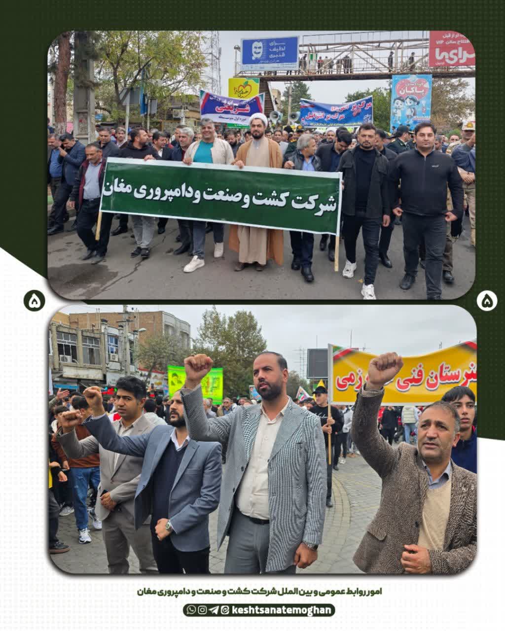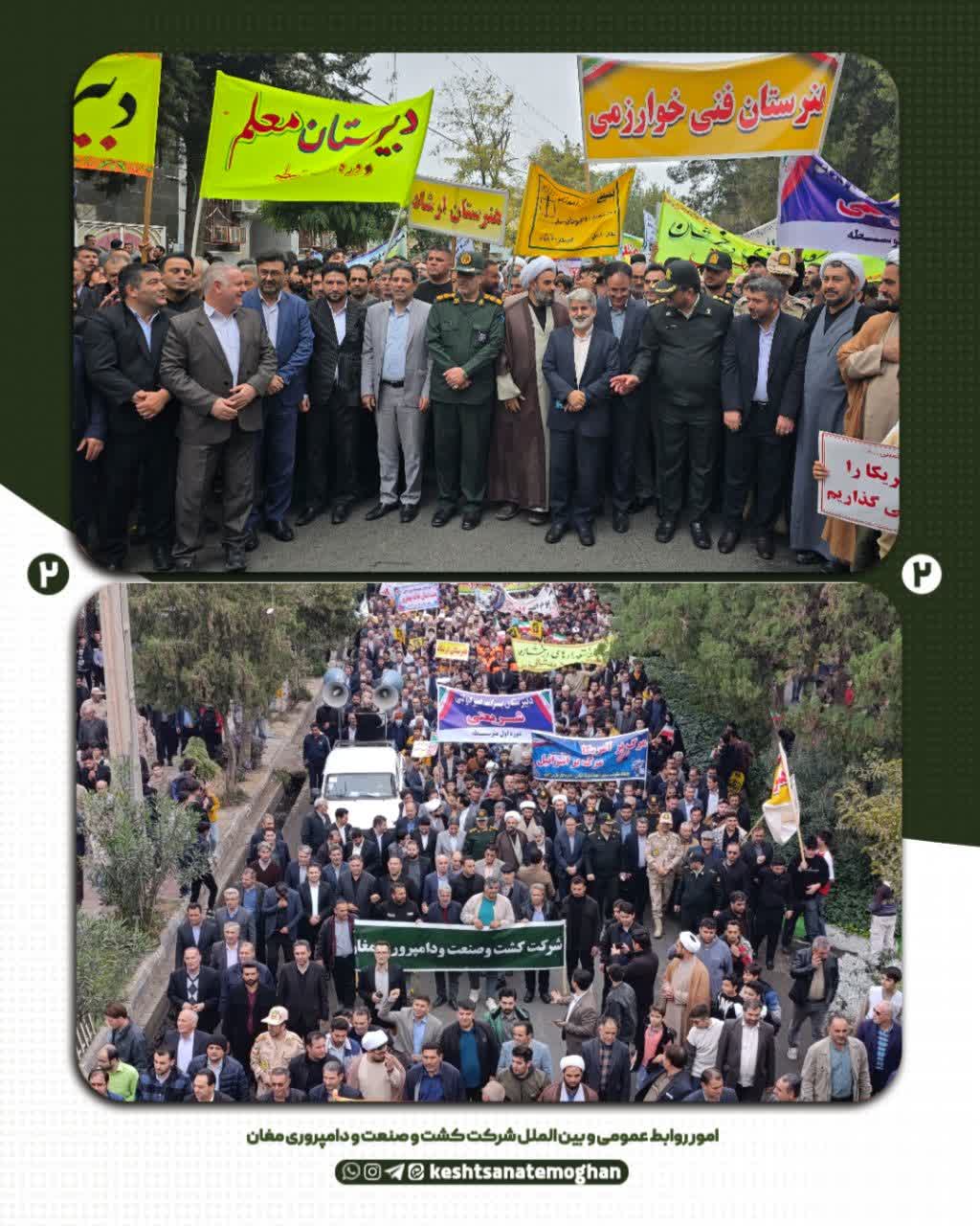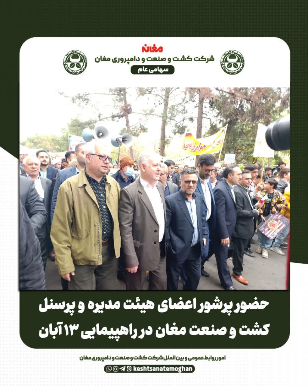 ✅ به گزارش امور روابط عمومی و بین الملل شرکت کشت و صنعت و دامپروری مغان همزمان با فرارسیدن ۱۳ آبان، روز ملی مبارزه با استکبار جهانی و روز دانش‌آموز، جمعی از مدیران، اعضای هیئت ‌مدیره و پرسنل این بنگاه اقتصادی با حضوری گسترده و پرشور در راهپیمایی این روز بزرگ در شهرستان پارس‌آباد شرکت کردند.