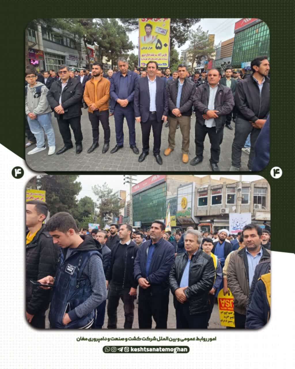 ⏪ کارکنان شرکت کشت و صنعت و دامپروری مغان همگام با مردم ولایت ‌مدار پارس‌آباد، با حضور در راهپیمایی روز دانش‌آموز، انزجار خود را از استکبار جهانی اعلام کردند.