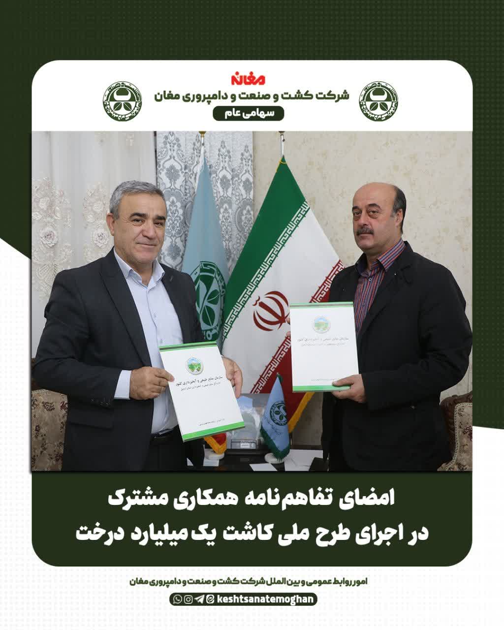✅ برای اجرای دقیق تفاهمنامه نیز مهندس سیدعلیحیدر راثینظام از سوی ادارهکل منابع طبیعی و مهندس احمد شهریار از سوی کشت و صنعت مغان بعنوان نمایندگان تامالاختیار معرفی شدند.