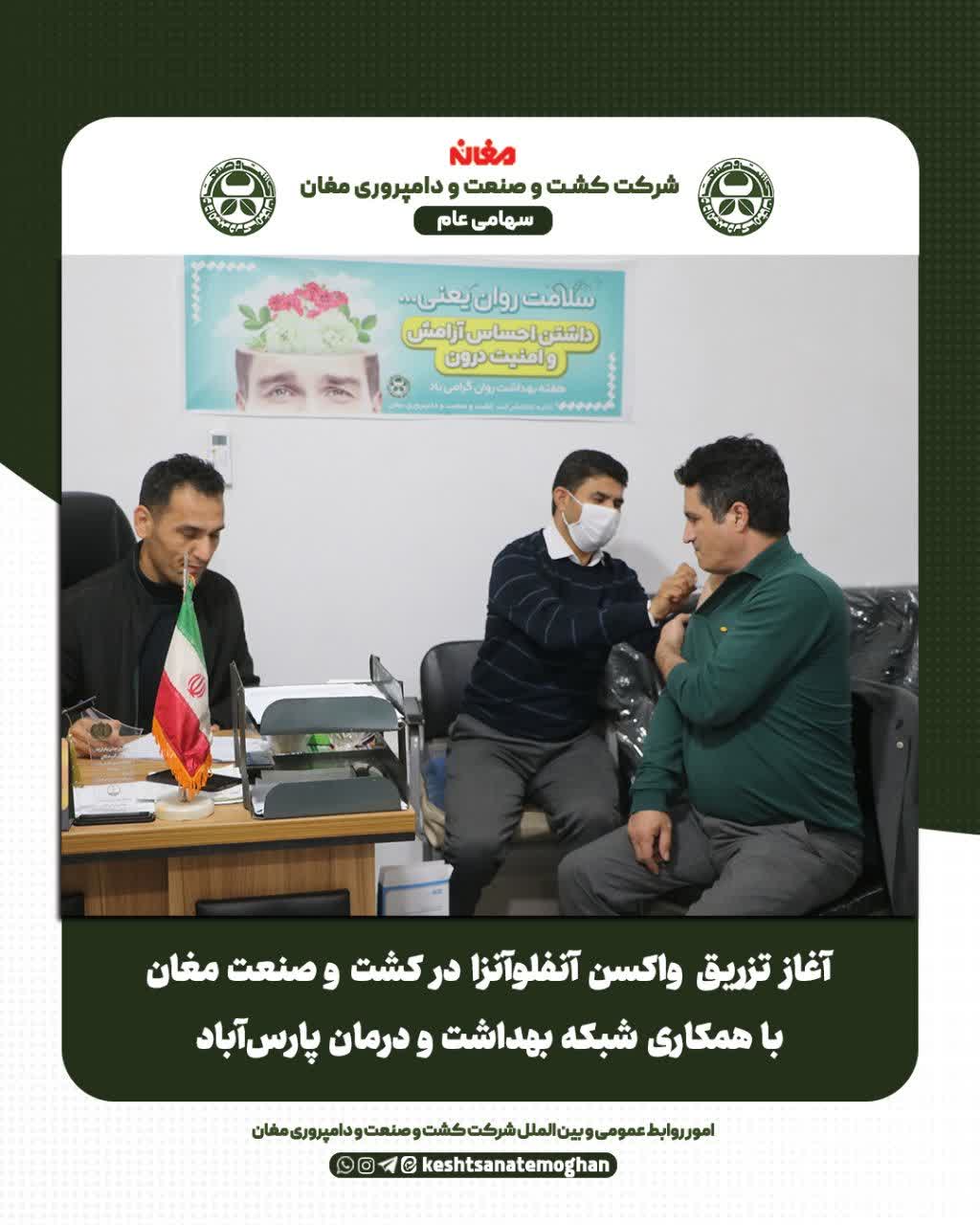 ⏪ به منظور پیشگیری از شیوع آنفلوآنزا و ارتقای سطح سلامت کارکنان، عملیات تزریق واکسن آنفلوآنزا توسط واحد بیماریهای شبکه بهداشت و درمان شهرستان پارسآباد مغان در امور پشتیبانی فنی و مکانیزه شرکت کشت و صنعت و دامپروری مغان آغاز شد.