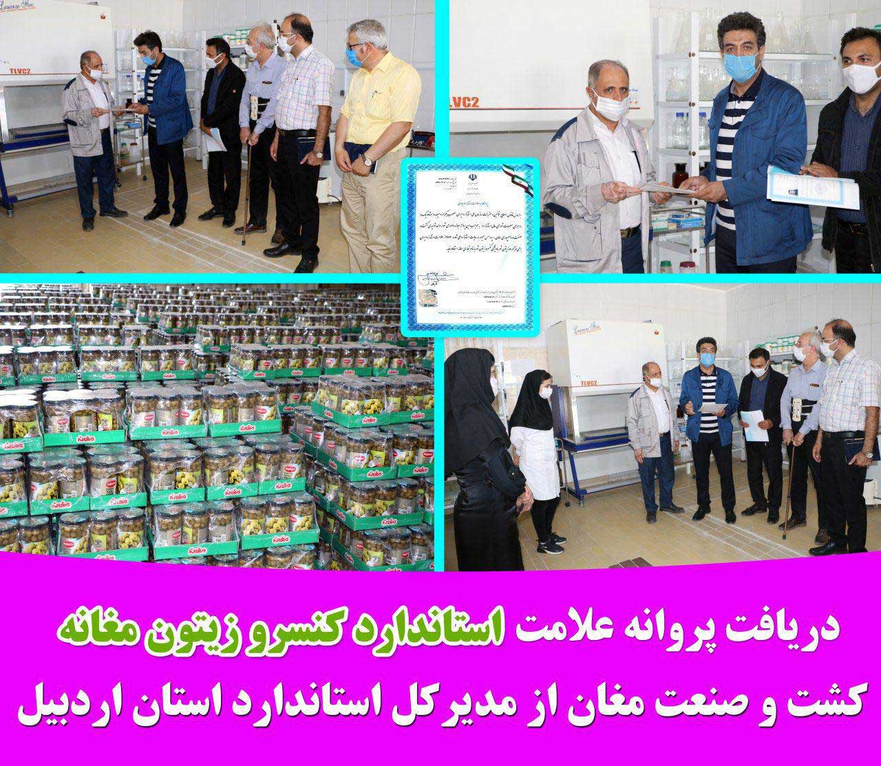 به گزارش روابط عمومی شرکت کشت و صنعت و دامپروری مغان پروانه علامت استاندارد برای کنسرو زیتون تولیدی در پروسس میوه شرکت با حضور مهندس هاشم علایی مدیرکل استاندارد استان اردبیل و کارشناسان مربوطه در محل کارخانه پروسس میوه بعد از بازدید از واحدهای تولیدی دریافت گردید