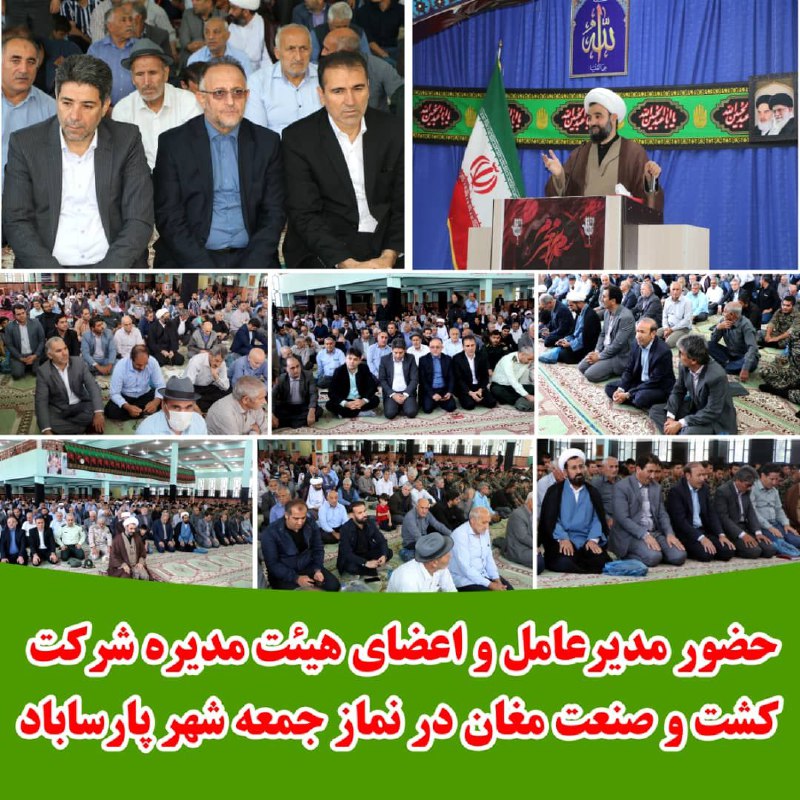 به گزارش روابط عمومی شرکت کشت و صنعت و دامپروری مغان دکتر قاسم محمدی، مدیرعامل، قدیر پسندی عضو هیئت مدیره و معاونت مالی اداری و بازرگانی و حسن نظیفی عضو هیئت مدیره و معاونت کشاورزی، دامپروری و صنعتی شرکت در مورخه 1401/6/18 در نماز عبادی- سیاسی جمعه شهر پارساباد مغان حضور یافته و نماز را به امامت حجت الاسلام والمسلمین حاج آقا بنابی، امام جمعه شهرستان پارساباد اقامه نمودند.