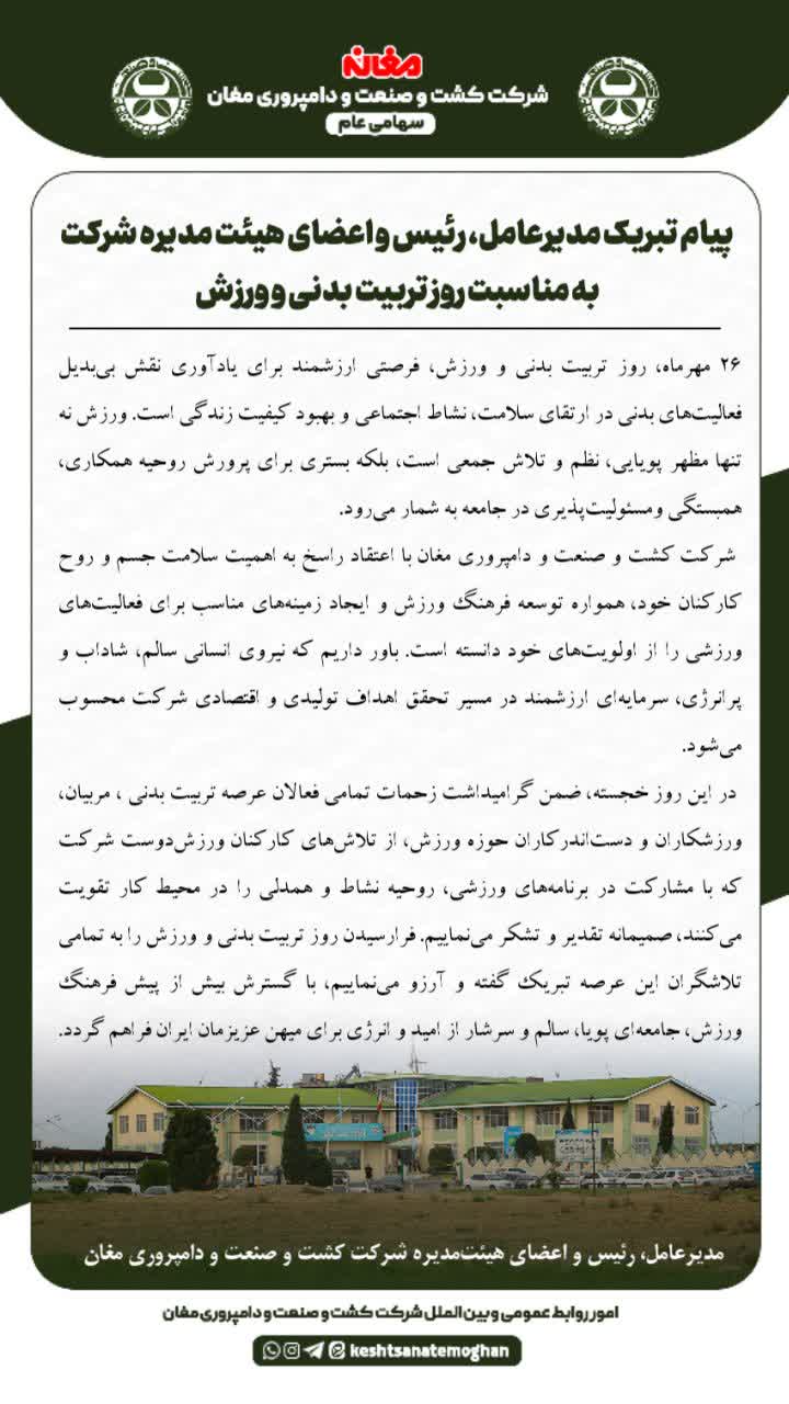 ✅ شرکت کشت و صنعت و دامپروری مغان با اعتقاد راسخ به اهمیت سلامت جسم و روح کارکنان خود، همواره توسعه فرهنگ ورزش و ایجاد زمینههای مناسب برای فعالیتهای ورزشی را از اولویتهای خود دانسته است. باور داریم که نیروی انسانی سالم، شاداب و پرانرژی، سرمایهای ارزشمند در مسیر تحقق اهداف تولیدی و اقتصادی شرکت محسوب میشود.