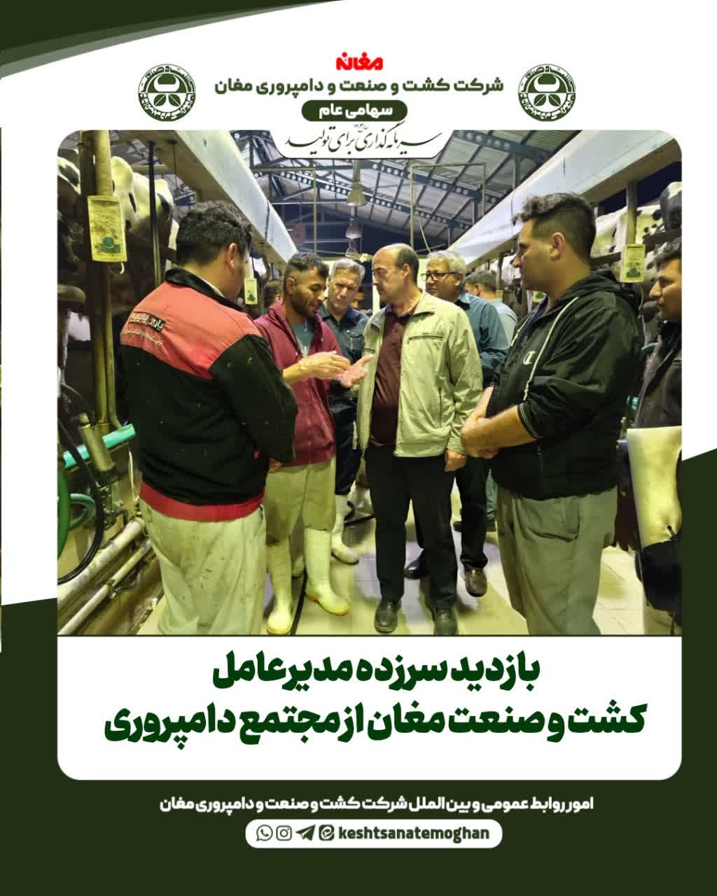 ✅ وی ضمن تقدیر ویژه از بدنه مدیریتی و کارگری مجتمع دامپروری، اهتمام شرافتمندانه و پرامید کارکنان شرکت را مایه افتخار مجموعه کشت و صنعت مغان عنوان کرد و افزود: تلاش خالصانه و متعهدانه همکاران ما، نماد واقعی جهاد اقتصادی و خدمت صادقانه در مسیر تأمین امنیت غذایی کشور است.