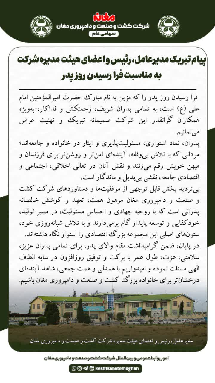 ✅ در پایان، ضمن گرامیداشت مقام والای پدر، برای تمامی پدران عزیز، سلامتی، عزت، طول عمر با برکت و توفیق روزافزون در سایه الطاف الهی مسئلت نموده و امیدواریم با همدلی و همت جمعی، شاهد آیندهای درخشانتر برای خانواده بزرگ کشت و صنعت و دامپروری مغان باشیم.