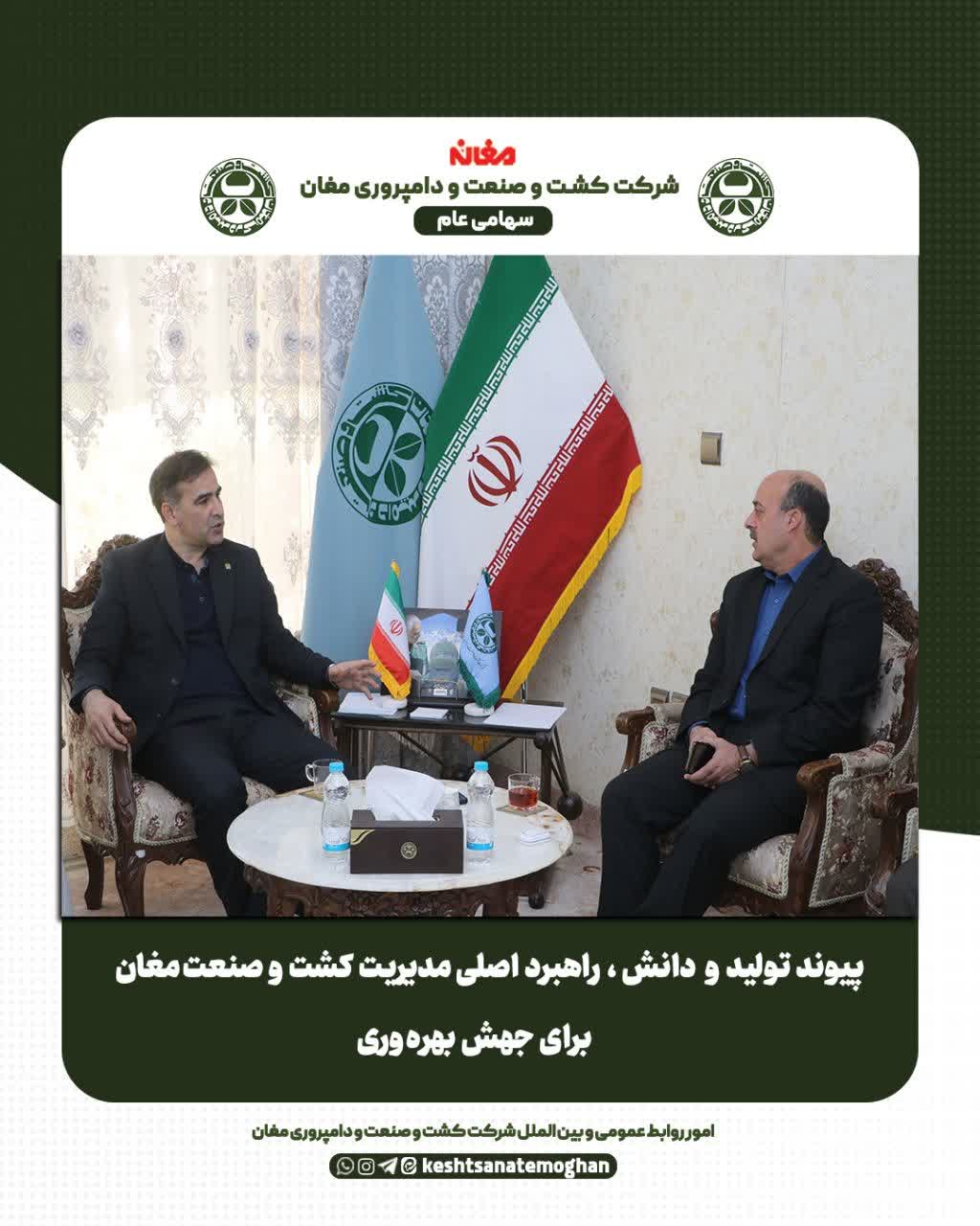 ⏪ مدیرعامل کشت و صنعت مغان در دیدار با رئیس دانشگاه محقق اردبیلی ضمن تاکید بر تداوم همکاری های علمی برای ارتقای تولیدات کشاورزی و دامی اظهار داشت: پیوند تولید و دانش، راهبرد اصلی مدیریت این بنگاه اقتصادی برای جهش بهره وری می باشد.