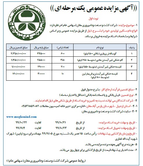 موضوع مزایده : شرکت کشت و صنعت ودامپروری مغان (سهامی عام )در نظردارد: انواع دام سنگین تولیدی خود را از طريق مزايده عمومي و بر اساس شرایط و مشخصات اسناد مزایده به فروش برساند.
