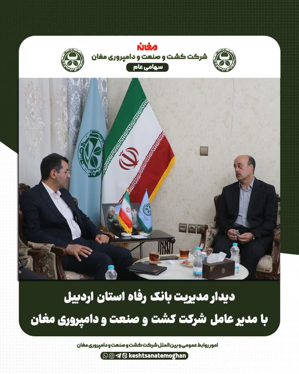 ✅به گزارش امور روابط عمومی و بین‌الملل شرکت کشت و صنعت و دامپروری مغان، در نشستی رسمی که با حضور مدیریت بانک رفاه کارگران استان اردبیل ومدیرعامل و رئیس و اعضای هیئت مدیره شرکت کشت و صنعت و دامپروری مغان برگزار شد، زمینه‌های توسعه همکاری‌های بانکی و سرمایه‌گذاری مشترک مورد بررسی قرار گرفت.