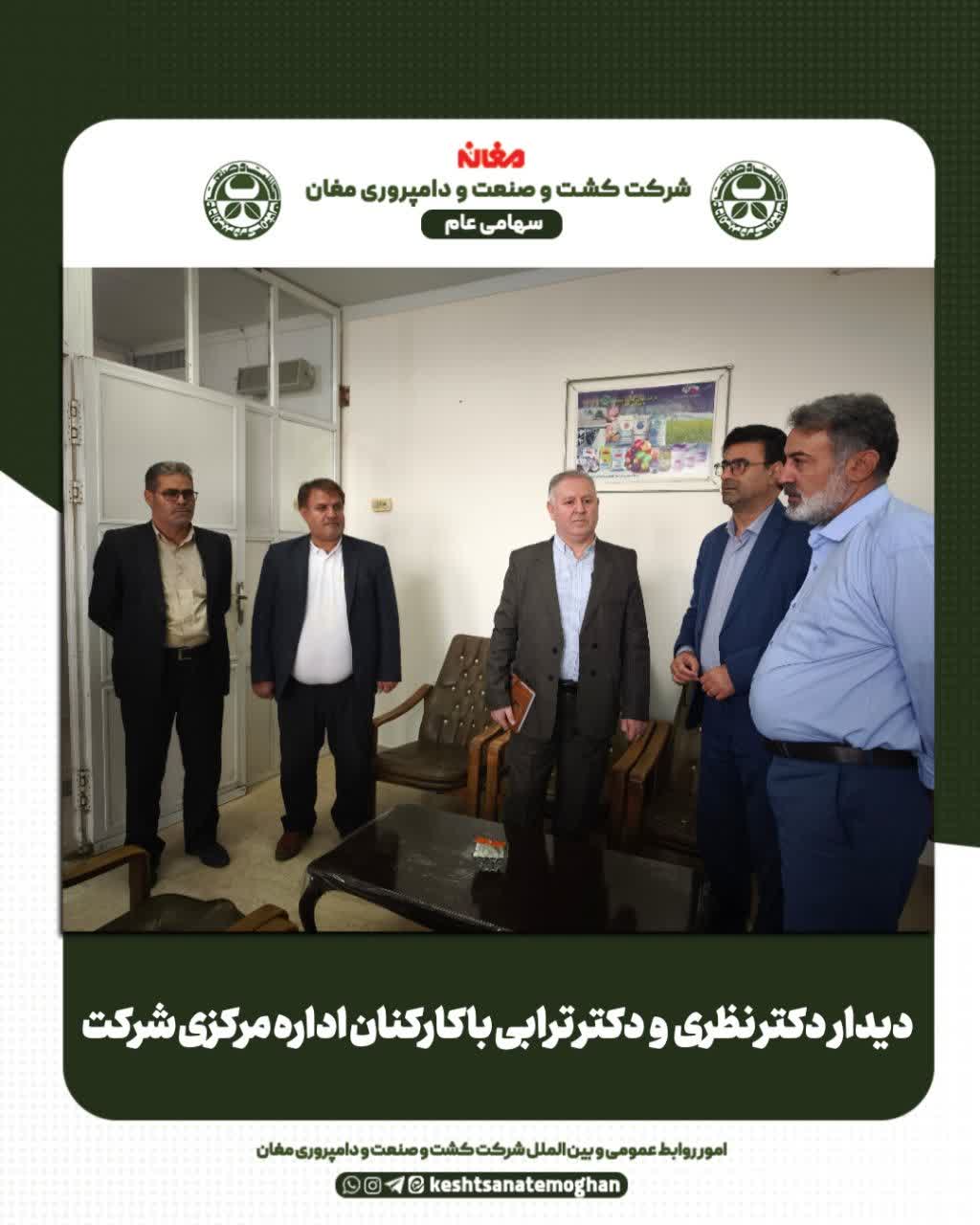 ⏪ در راستای تقویت ارتباطات درونسازمانی و توجه به جایگاه منابع انسانی، دکتر علی نظری، جانشین مدیرعامل و دکتر موسی ترابی، نایب رئیس هیئت مدیره شرکت کشت و صنعت و دامپروری مغان با کارکنان اداره مرکزی این شرکت دیدار و گفتگو کردند.