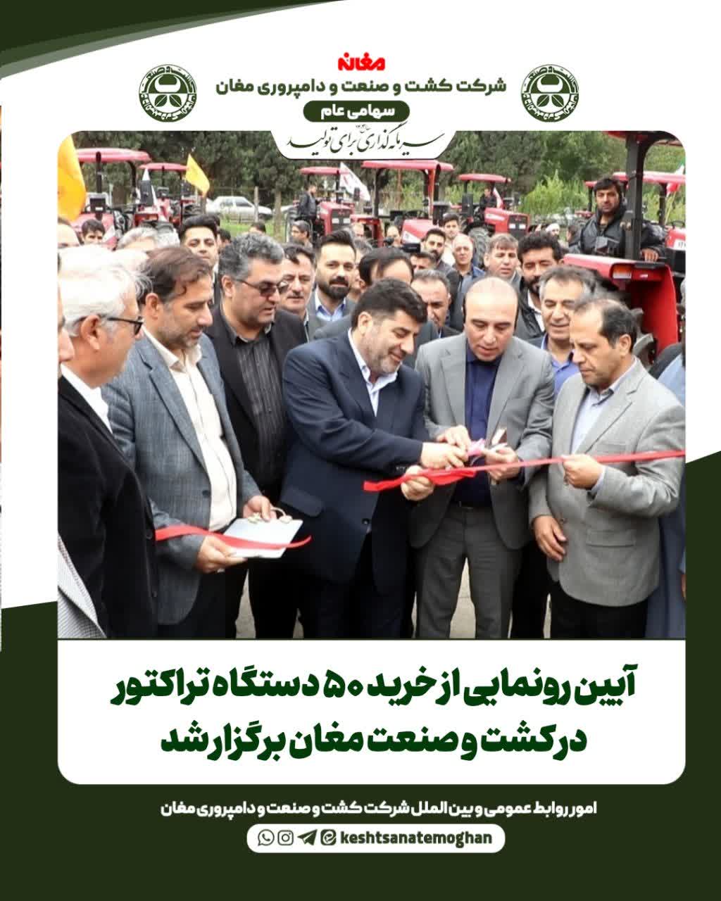 ✅ لازم بذکر است، مراسم رونمایی از خرید تراکتورهای مذکور با بریدن روبان قرمز توسط دکتر اکبر فتحی، معاون برنامهریزی و اقتصادی وزارت جهاد کشاورزی در محل انبارهای مرکزی شرکت کشت و صنعت و دامپروری مغان خاتمه یافت.