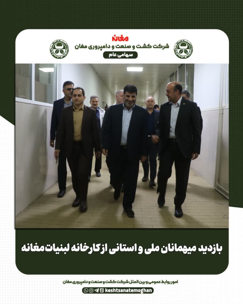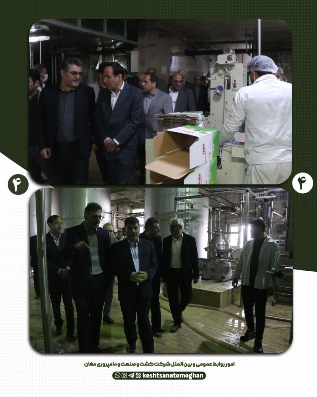 ✅ به گزارش امور روابط عمومی و بینالملل شرکت کشت و صنعت و دامپروری مغان، هیأتی از مسئولان ملی و استانی از جمله اکبر فتحی، معاون برنامهریزی و اقتصادی وزارت جهاد کشاورزی؛ پیمان اسکندری، مدیرعامل و رئیس هیئت مدیره شرکت شهرکهای کشاورزی؛ صفدر نیازی، معاون آب و خاک وزارت جهاد کشاورزی به همراه مجمع نمایندگان استان اردبیل؛ بهروز خلیلی، معاون هماهنگی امور اقتصادی استانداری اردبیل؛ حسین احدی عالی، رئیس سازمان جهاد کشاورزی استان اردبیل؛ و غلام میرزاحسینی، مدیرکل تعاون روستایی استان اردبیل، از کارخانه لبنیات مغانه بازدید کردند.