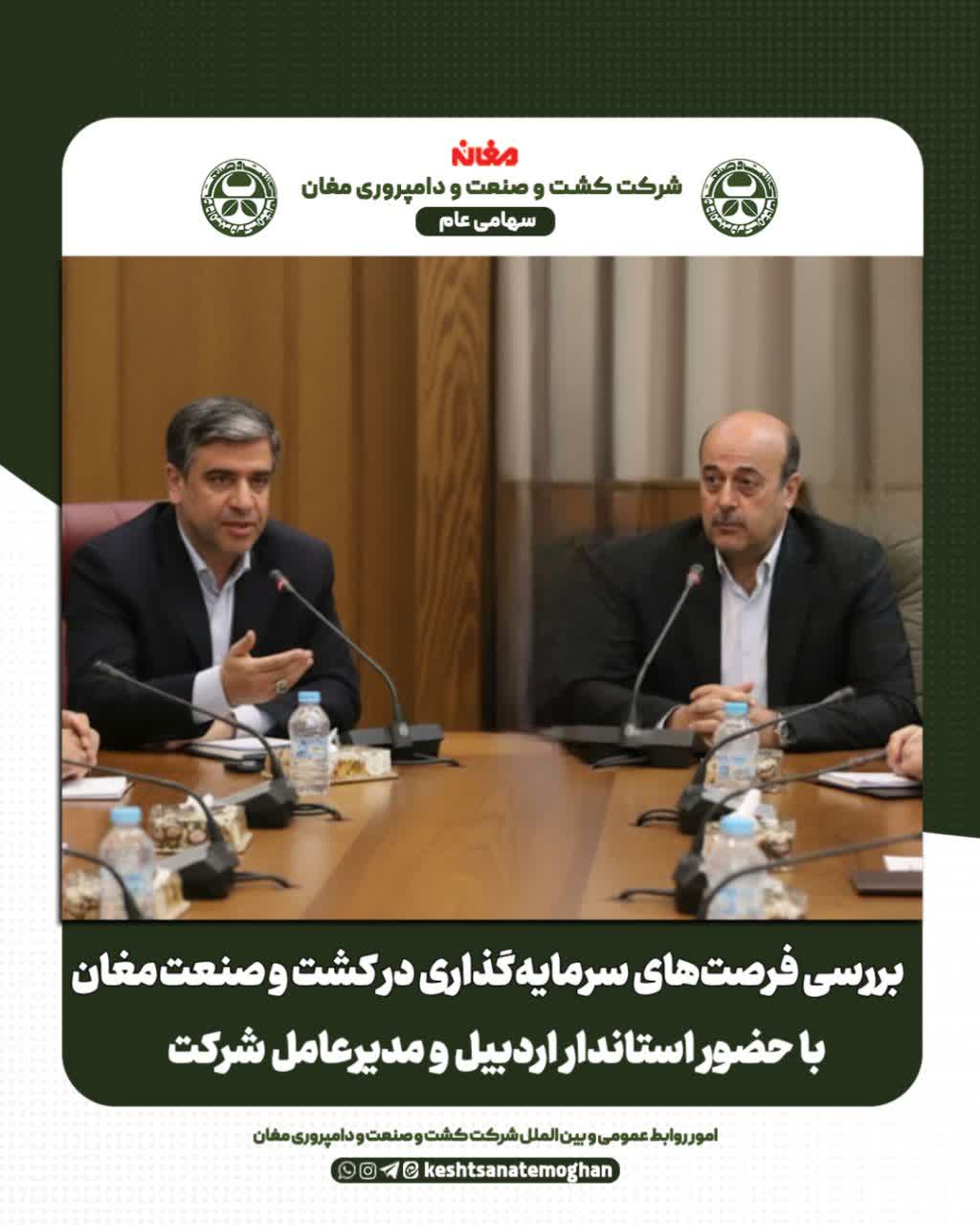 ⏪ در راستای توسعه فعالیتهای اقتصادی و جذب سرمایهگذاریهای کلان، مهندس خلیل نیکشاد، مدیرعامل شرکت کشت و صنعت و دامپروری مغان به همراه دکتر مسعود امامی یگانه، استاندار اردبیل، دیدارهایی با هلدینگها و شرکتهای بزرگ سرمایهگذاری کشور در تهران برگزار کردند.