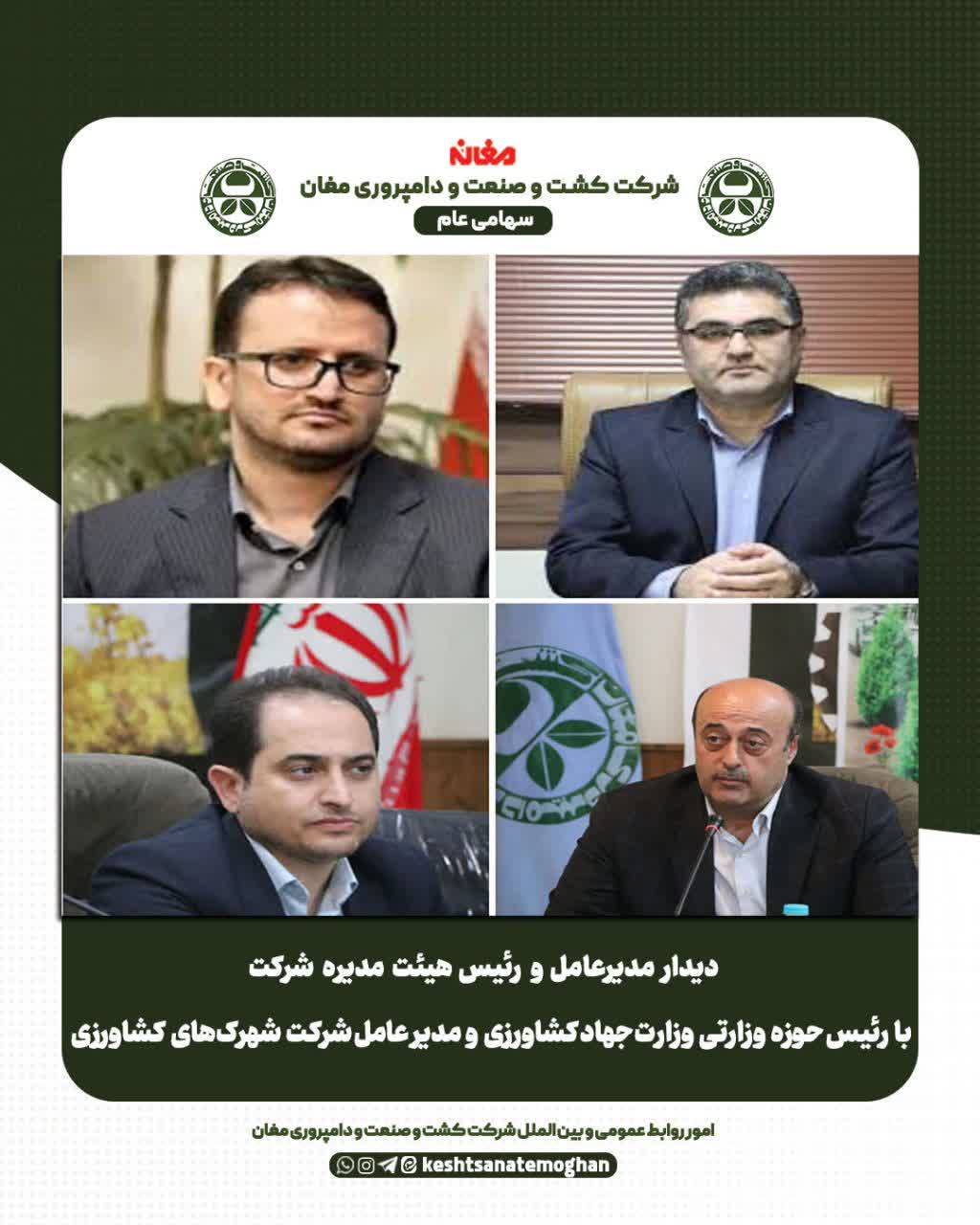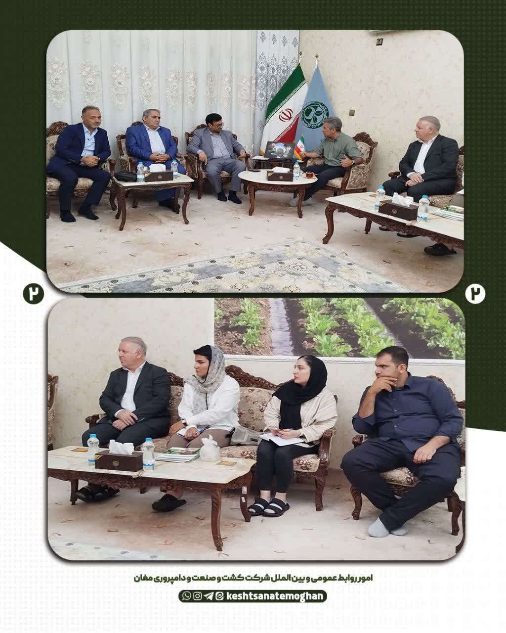 ⏪ در جریان دیداری رسمی، مدیرعامل و رئیس هیئت مدیره شرکت کشت و صنعت و دامپروری مغان با مهندس نجاتی، مشاور و رئیس حوزه وزارتی وزارت جهاد کشاورزی و همچنین دکتر پیمان اسکندری، مدیرعامل شرکت شهرکهای کشاورزی دیدار و گفتوگو کردند.