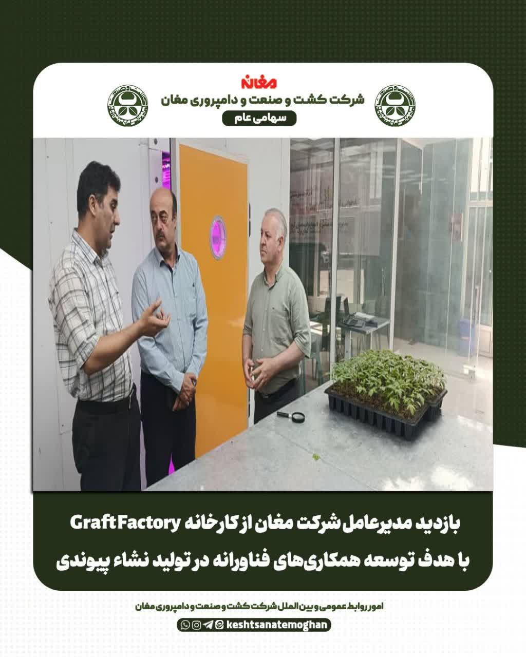 ⏪ در راستای جذب سرمایهگذاری، ارتقای بهرهوری و توسعه دانشبنیان در بخش کشاورزی، مدیرعامل و نایب رئیس هیئت مدیره کشت و صنعت مغان از کارخانه پیشرفته Graft Factory بازدید کرد.