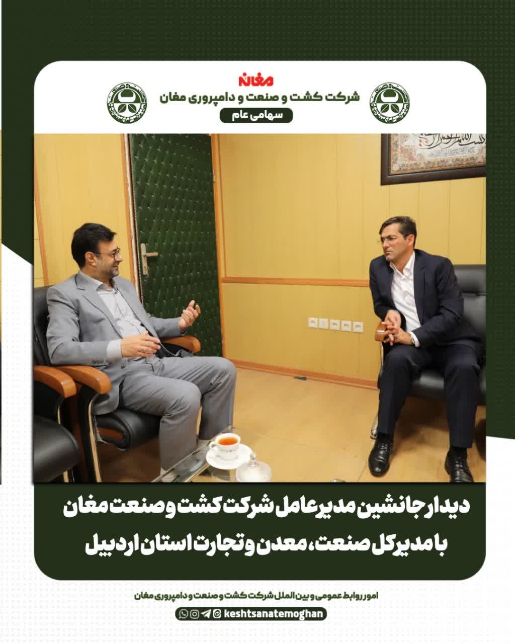 ⏪ بهمنظور ارتقای کیفیت و دسترسی شهروندان به محصولات باارزش و حمایت از تولید داخلی، دکتر آقای علی نظری شیخ احمد، جانشین مدیر عامل و عضو هیئتمدیره شرکت کشت و صنعت و دامپروری مغان، در نشستی صمیمانه با جناب آقای دکتر رامین صادقی، مدیرکل صنعت، معدن و تجارت استان اردبیل، دیدار و گفتگو کردند.