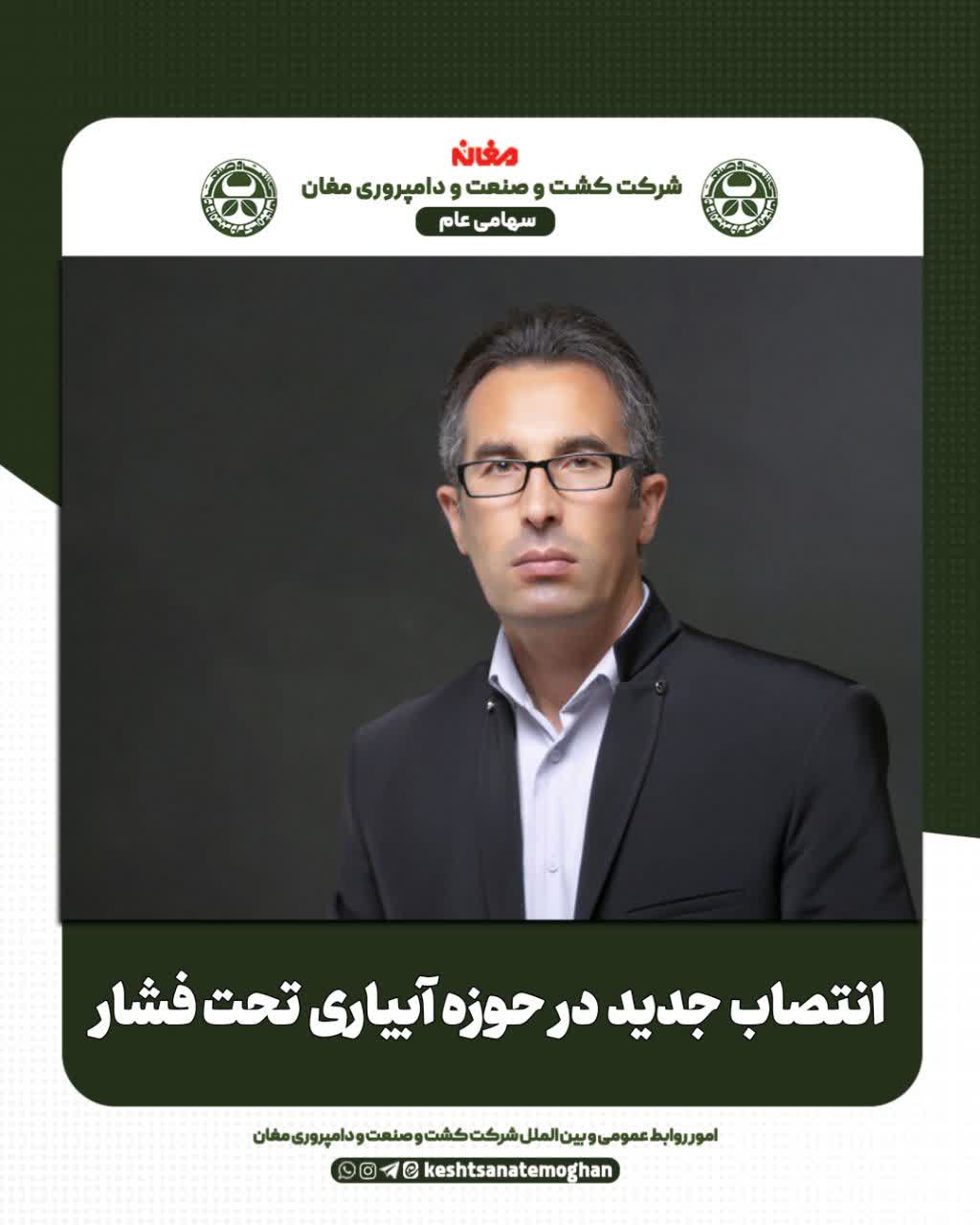 ⏪ به گزارش امور روابط عمومی و بین الملل شرکت کشت و صنعت و دامپروری مغان طی حکمی که به امضای مهندس خلیل نیکشاد، مدیرعامل شرکت رسید؛ مهندس صفر قبادی بعنوان مسئولیت مدیریت پروژه آبیاری تحت فشار شرکت تعیین و منصوب گردید.