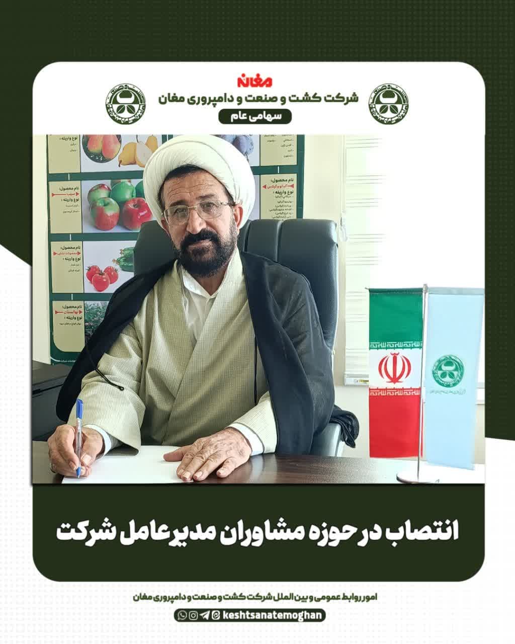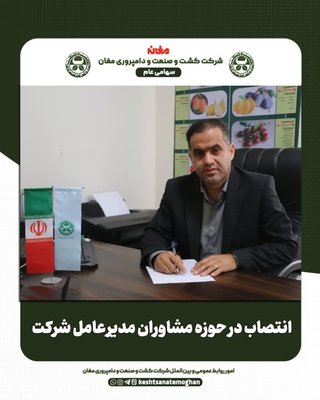 ✅به گزارش امور روابط عمومی و بین الملل شرکت کشت و صنعت و دامپروری مغان طی حکمی که به امضای مهندس خلیل نیک شاد، مدیر عامل شرکت رسید، کریم جعفرزاده بعنوان مشاور مدیر عامل در امور حقوقی تعیین و منصوب گردید.