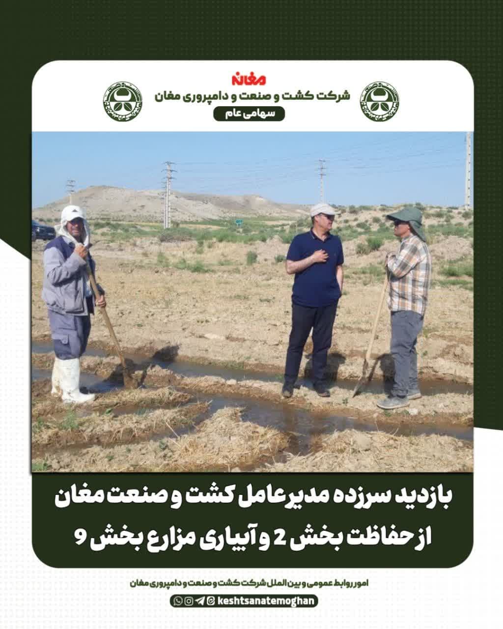 ✅ به گزارش امور روابط عمومی و بین الملل شرکت کشت و صنعت و دامپروری مغان این بازدید بدون هماهنگی قبلی و با هدف ارزیابی میدانی شرایط کاری و بررسی عملکرد نیروهای فعال در این حوزهها صورت گرفت و مدیرعامل شرکت ضمن حضور در محل فعالیت مأموران و کارکنان بخش حفاظت و تیمهای اجرایی آبیاری، از نزدیک در جریان روند کاری، چالشهای موجود و تلاشهای آنان برای حفظ امنیت اراضی و بهرهبرداری بهینه از منابع آبی قرار گرفت.