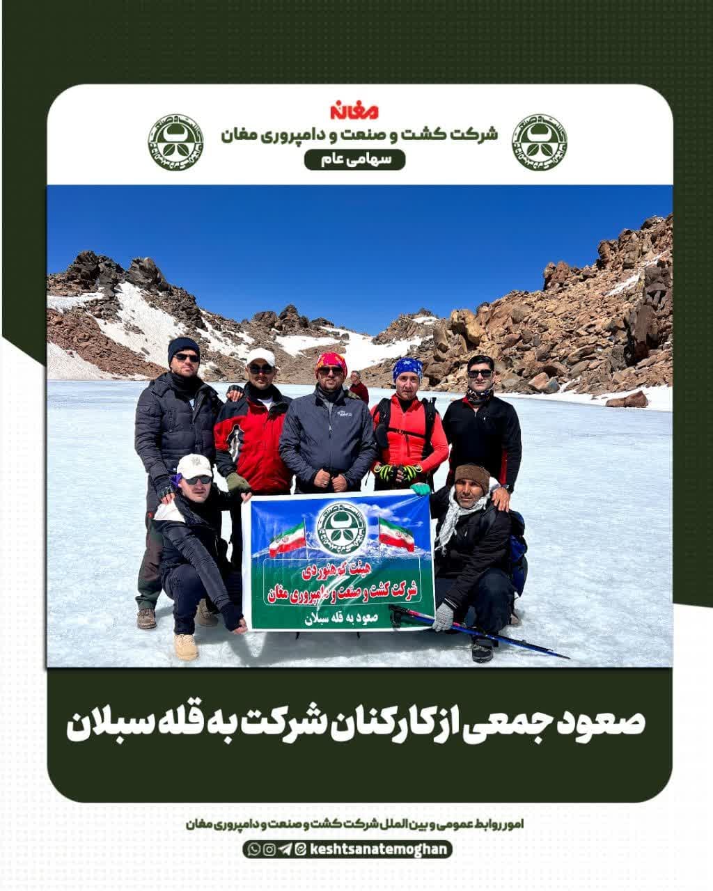 ✅ به گزارش امور روابط عمومی و بین الملل شرکت کشت و صنعت و دامپروری مغان افراد صعودکننده به قله سبلان بهزاد عباسزاده، بهزاد برنده، احمد احمدی، میثم رنجی، احمد پارسافر، کیانفر فرهادی و شهریار صفرپور بودند که اشخاص فوق الذکر از واحدهای مختلف شرکت هستند.