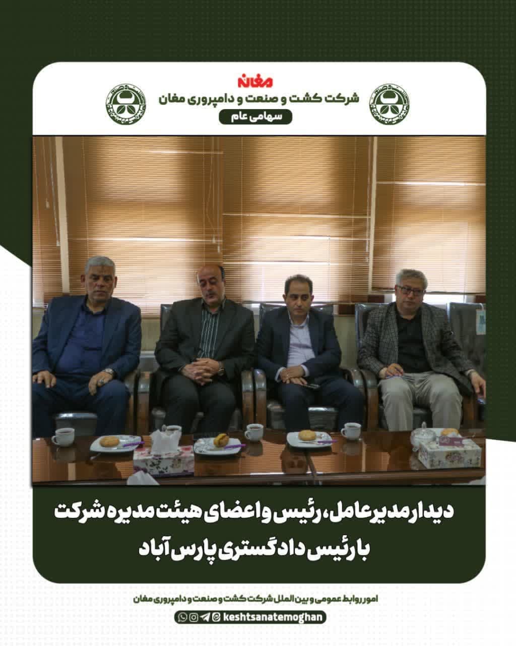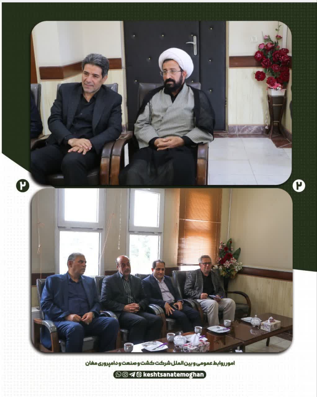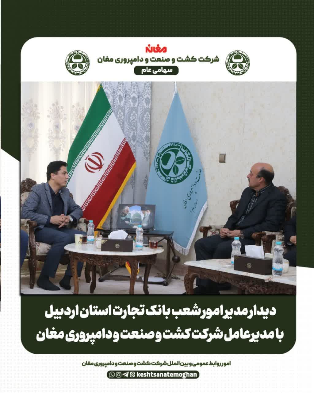 ⏪به گزارش امور روابط عمومی و بینالملل شرکت کشت و صنعت و دامپروری مغان مهندس پیام حاج محمدی، مدیر امور شعب بانک تجارت استان اردبیل با مهندس خلیل نیکشاد، مدیرعامل شرکت مغان ، دیدار و گفتگو کرد.