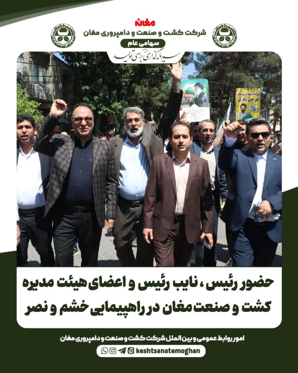 ✅ به گزارش امور روابط عمومی و بینالملل شرکت کشت و صنعت و دامپروری مغان این راهپیمایی بعد از نماز دشمن شکن جمعه انجام گرفت و شعاردهندگان در طول مسیر از محل مصلا تا چهاراه حضرت امام (ره) ضمن سر دادن شعارهای مرگ بر صهیونیست، مرگ بر اسرائیل، مرگ بر منافق و ای رهبر آزاده، آماده ایم آماده؛ اوج نفرت و انزجار خویش را از رژیم جعلی صهیونی و حامیان جهانخوارش در معرض نمایش قرار دادند.