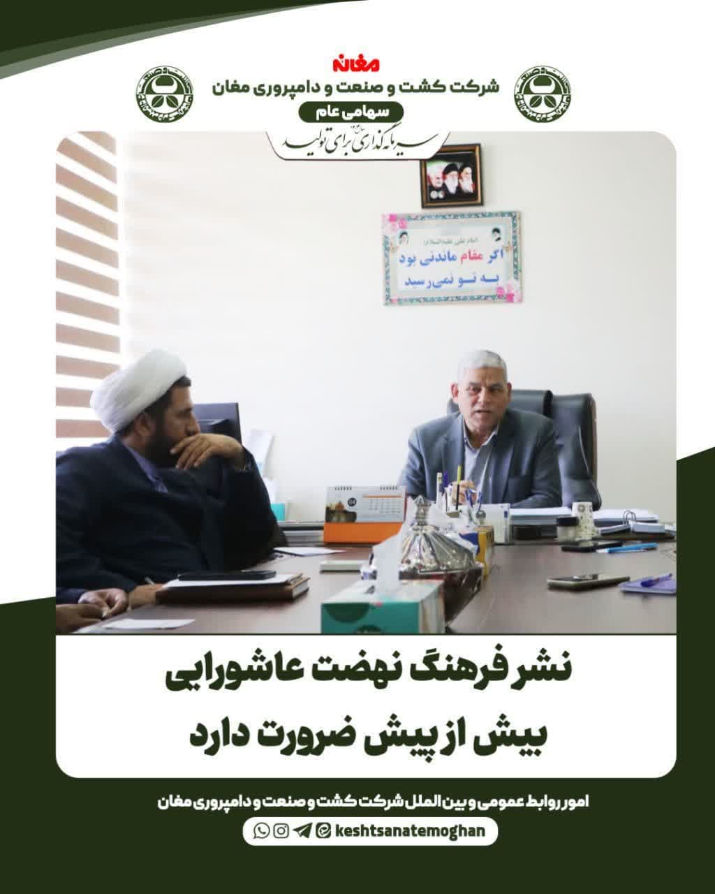 ✅ به گزارش امور روابط عمومی و بین الملل شرکت کشت و صنعت و دامپروری مغان مهندس صفرعلی نظریان، رئیس شورای فرهنگی شرکت با تاکید بر پررنگ تر شدن هر چه بیشتر برنامه های فرهنگی در شرکت خاطر نشان کرد: مکتب سرور و سالار شهیدان برای همیشه در طول تاریخ زنده و پویا مانده و رمز ماندگاری شیعه نیز تاسی به عشق و شور حسینی بوده است و جا دارد با سلسله کارهای فرهنگی در سطح جامعه و شرکت نسبت به تبیین آموزه های عاشورایی اقدام گردد.