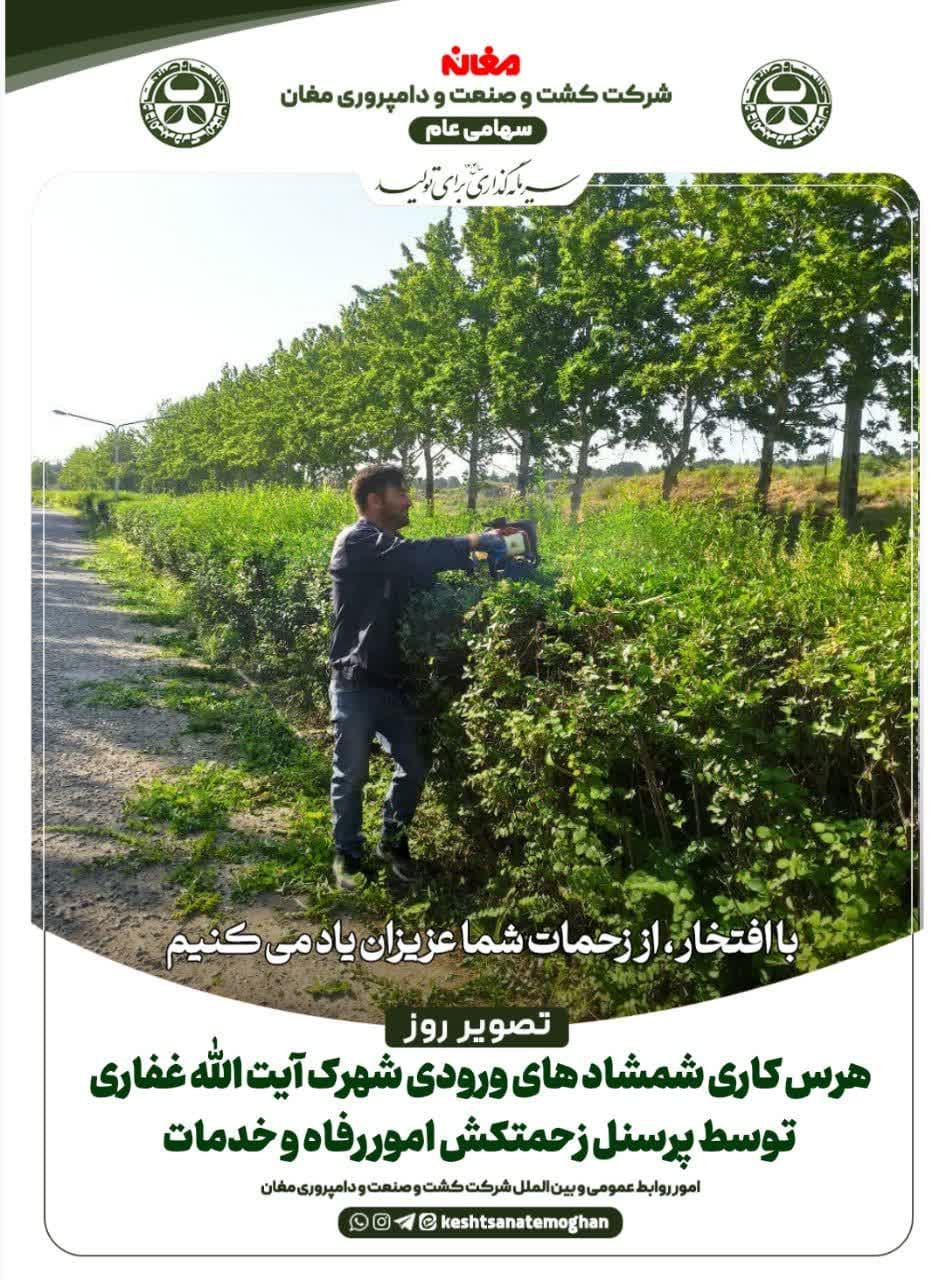 💢هرس کاری شمشادهای ورودی شهرک آیت الله غفاری توسط پرسنل زحمتکش امور رفاه و خدمات