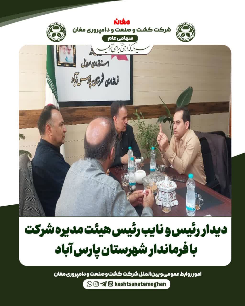 ⏪ به منظور تعامل بیشتر با نماینده عالی دولت در شهرستان پارس آباد دکتر علی میرزازاده، رئیس هیئت مدیره؛ مهندس محبوب فروزنده، نایب رئیس هیئت مدیره و مهندس کیومرث خانمحمدیان، معاون فنی و صنعتی مدیر عامل شرکت با مهندس علی لطفی، فرماندار شهرستان پارس آباد دیدار و گفتگو کردند.