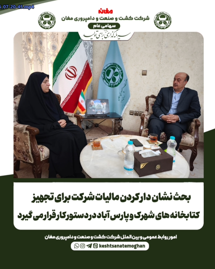 ✅ به گزارش امور روابط عمومی و بین الملل شرکت کشت و صنعت و دامپروری مغان مهندس خلیل نیکشاد، مدیرعامل شرکت در این دیدار از تجهیز کتابخانه شهرک سخن به میان آورده و خاطر نشان کرد: از محل نشان دار کردن مالیات شرکت نسبت به جانمایی فضای فیزیکی مناسب برای کتابخانه شهرک و تجهیز آن به نرم افزارهای لازم در طی بازه زمانی دو- سه ساله اقدام لازم صورت می گیرد.