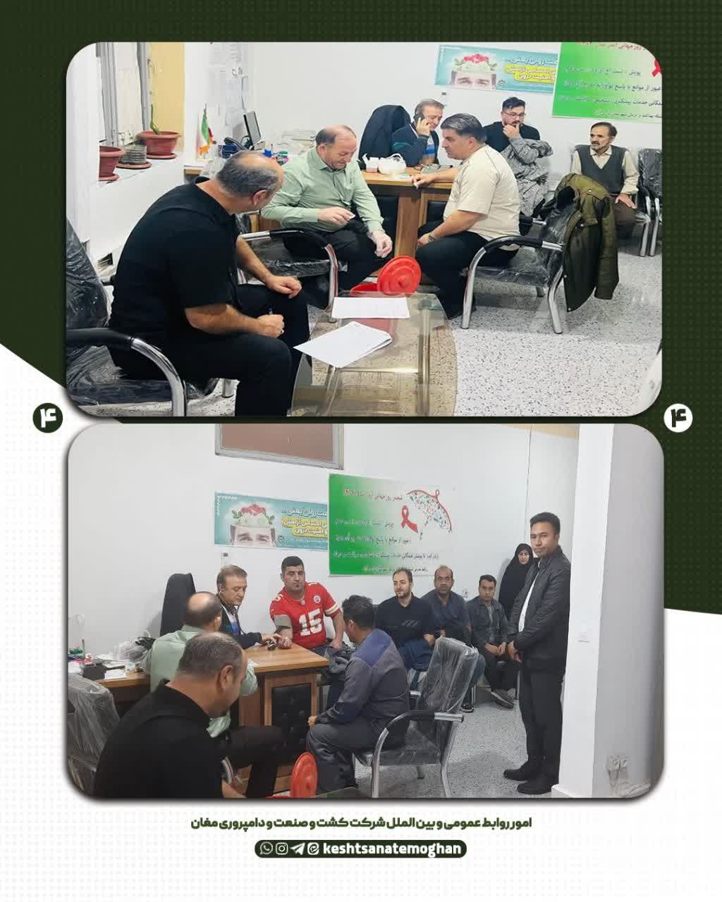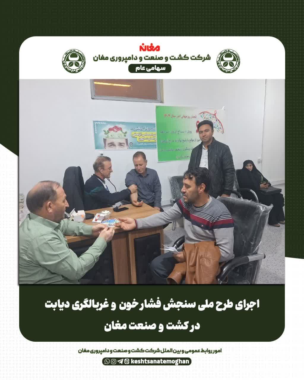 ✅ به گزارش امور روابط عمومی و بین الملل شرکت کشت و صنعت و دامپروری مغان در مرحله نخست این طرح، علاوه بر پرسنل امور پشتیبانی فنی و مکانیزه، کارکنان انبار مرکزی شرکت نیز تحت غربالگری قرار گرفتند. طی این فرآیند، اندازه گیری فشار خون، سنجش قند خون، ارزیابی عوامل خطر و ثبت اطلاعات سلامت کارکنان انجام شد.