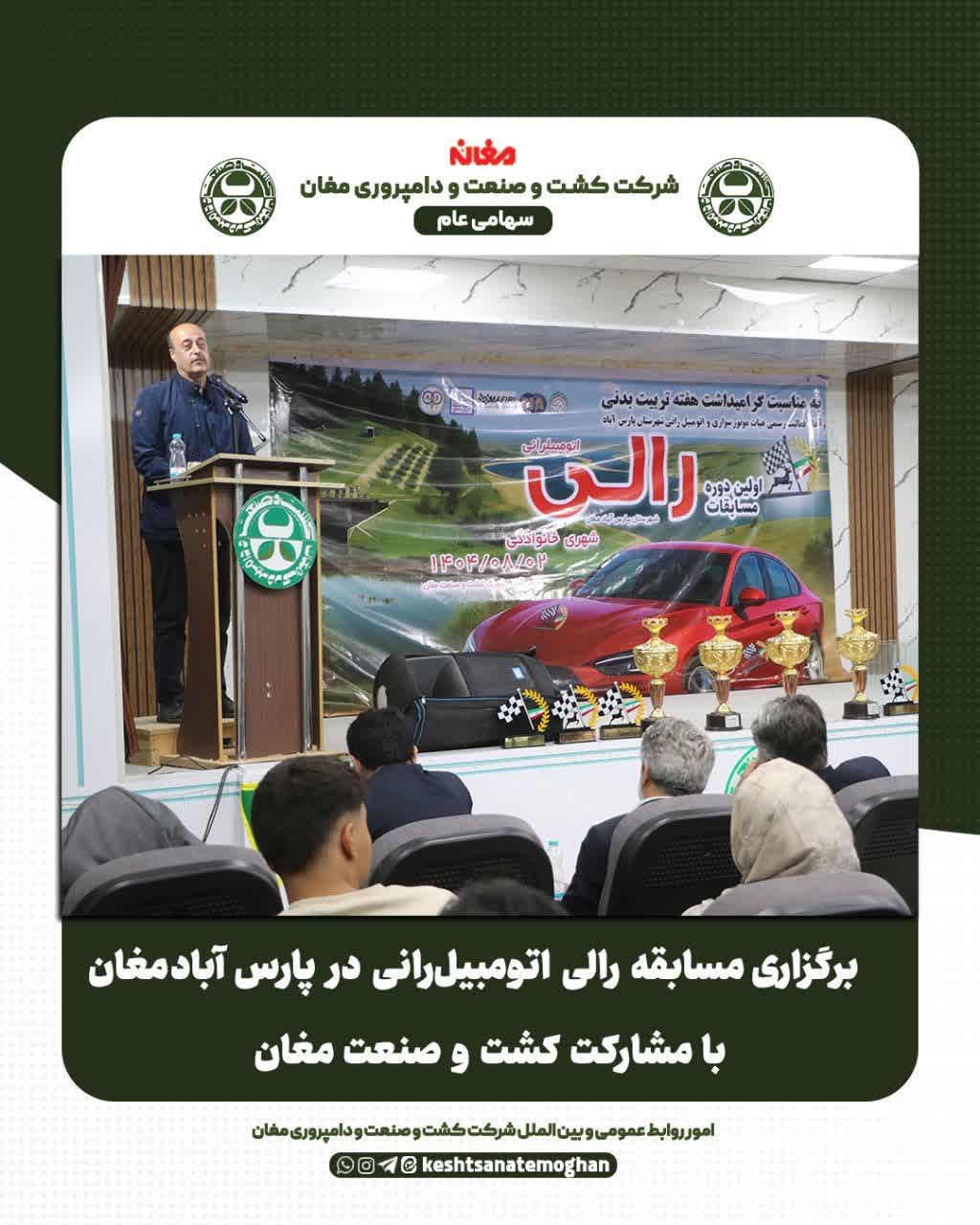 ✅ همزمان با پایان مسابقه، مهندس خلیل نیک شاد، مدیرعامل شرکت کشت و صنعت و دامپروری مغان به دلیل همکاری و حمایت از برگزاری مسابقات رالی توسط مهندس ابراهیم فهیمی، نماینده شهرستان های پارس آباد، بیله سوار و اصلاندوز؛ مهندس علی لطفی، فرماندار شهرستان پارس آباد و مهندس برات پیری، رئیس اداره ورزش و جوانان شهرستان پارسآباد مورد تجلیل و قدردانی قرار گرفت.