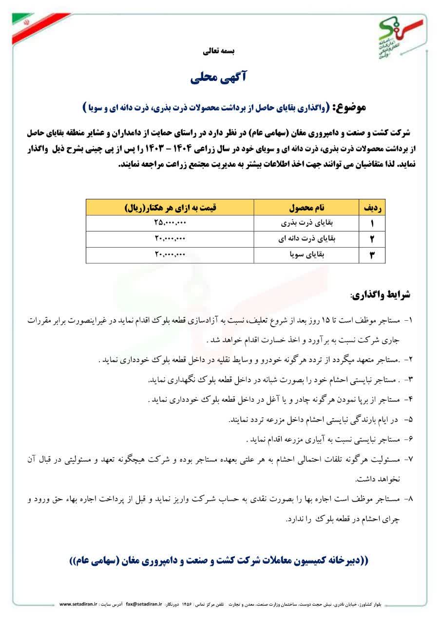⏪شرکت کشت و صنعت و دامپروری مغان (سهامی عام) در نظر دارد در راستای حمایت از دامداران و عشایر منطقه بقایای حاصل از برداشت محصولات ذرت بذری، ذرت دانه ای و سویای خود در سال زراعی 1404 – 1403 را پس از پی چینی بشرح ذیل واگذار نماید. لذا متقاضیان می توانند جهت اخذ اطلاعات بیشتر به مدیریت مجتمع زراعت مراجعه نمایند.